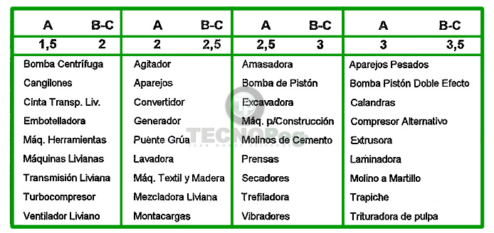 HP x fs. ó Kw x 1.36 x fs (ver Tabla 1: Factor de Servicio)